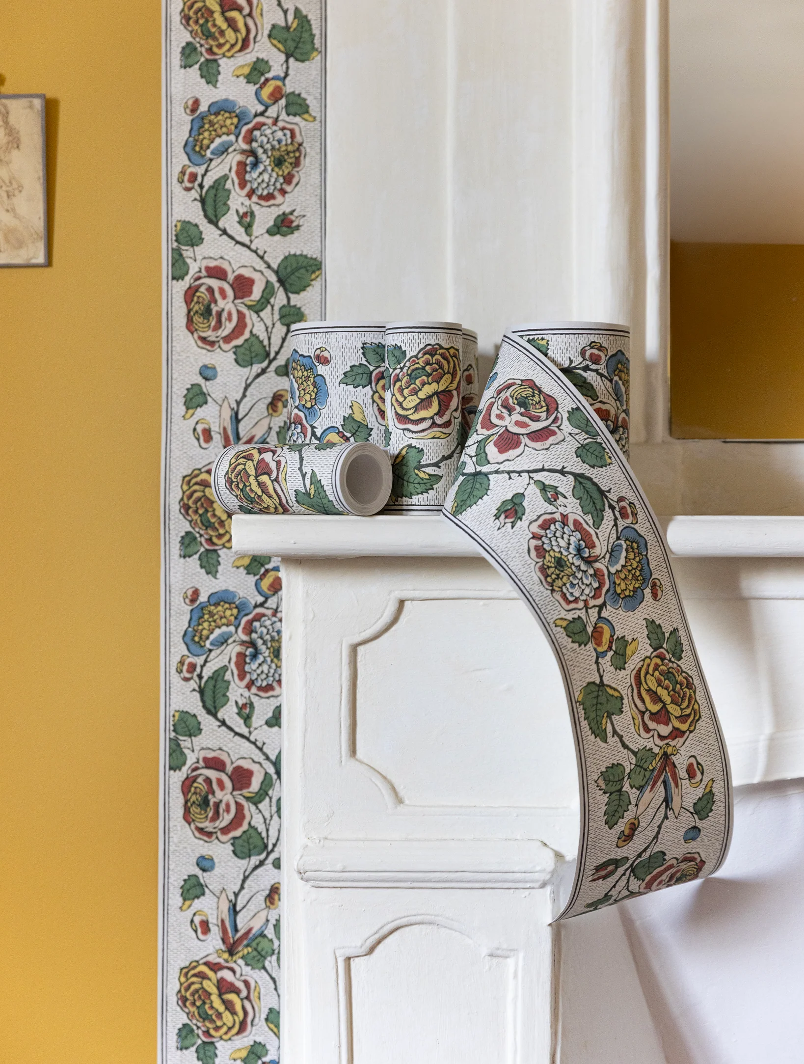 Interprétation d'un motif historique du XVIIIe siècle. Toute la collection de frises est conçue pour s'accorder avec de nombreuses couleurs de la gamme de peintures en collaboration avec la marque Ressource.